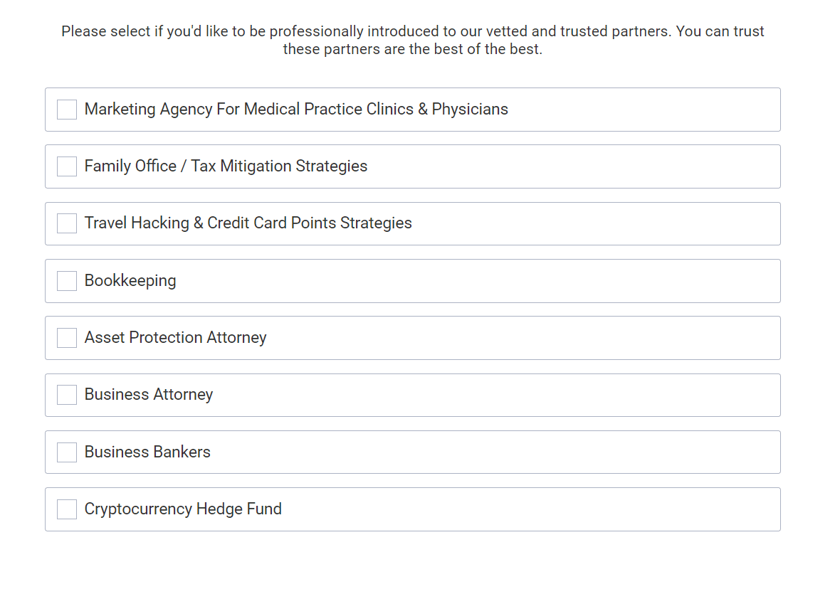 • You're tired of the "Gurus": let's face it physicians are one of the most abused professions when it comes to advertising. Every second of the day, you feel someone is trying to get something from you. Most programs overpromise and under-deliver only showing the results of the top 1% of people who joined. We wanted to build the #1 solution for physicians to build wealth and achieve financial freedom. Something different, something that under promises and over-delivers. Something that guarantees results for every single person that joins. Something that will dramatically change your life forever and impact your lifestyle like you'd never imagined possible.
